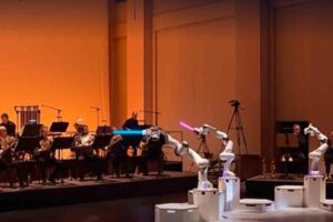 🔺 Entrenado para coordinar a tres grupos musicales a la vez, la máquina sorprendió con su capacidad de mover sus extremidades de forma independiente, una tarea imposible para un director humano Un...