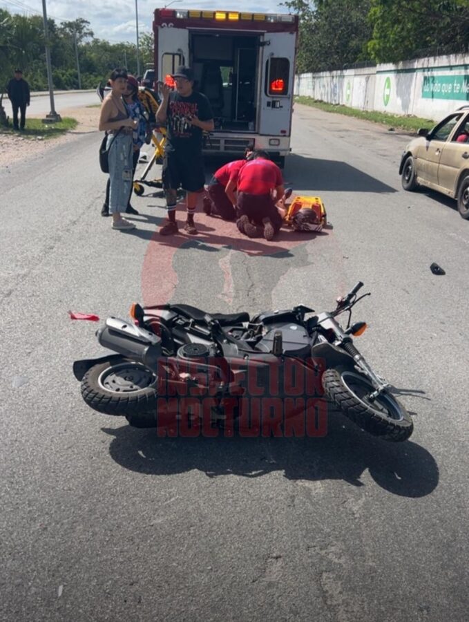 Trasladan al hospital a un motociclista que se impactó en la parte trasera de un taxi cuando circulaba en una de las entradas del fraccionamiento Real Ibiza, a exceso de velocidad y no se percató de que la unidad de alquiler se detuvo.