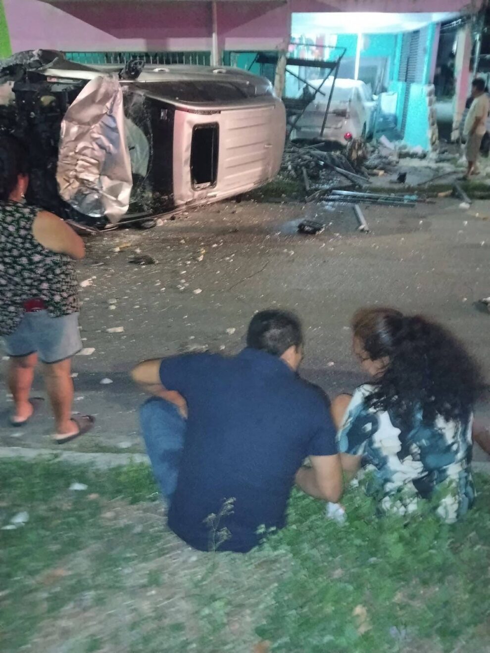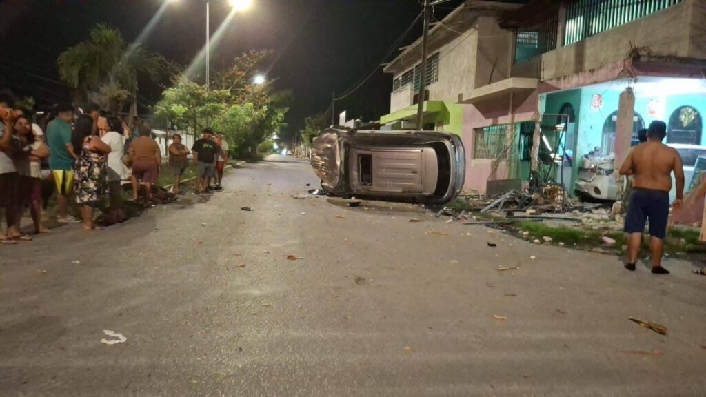 Un fuerte accidente vial se registró durante la madrugada de este martes en la avenida Chetumal, en el cruce con Campamento Vega, donde un conductor perdió el control de su vehículo y chocó contra otro automóvil que estaba dentro de una cochera, dañando fachadas de viviendas y luego terminar volcado.
