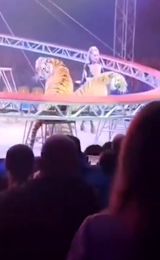 Según el portal noticioso Life.ru, que publicó un vídeo, el incidente ocurrió durante una presentación que contaba con dos domadores y tres tigres, separados del público por una malla de seguridad colgada de un aro de varios metros de diámetro.