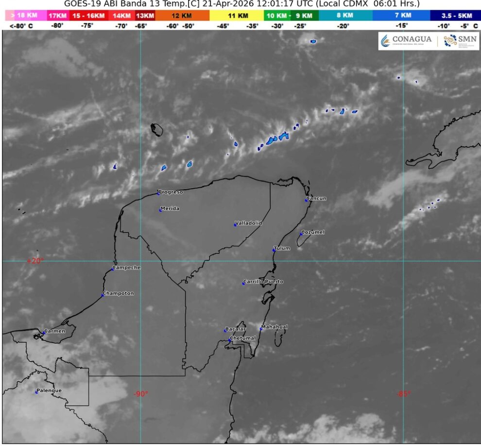 En la Península de Yucatán, el cielo estará medio nublado a nublado en el transcurso del día con lluvias e intervalos de chubascos en Campeche, Yucatán y Quintana Roo. Por la mañana, ambiente templado a cálido; en la tarde, caluroso en la península.