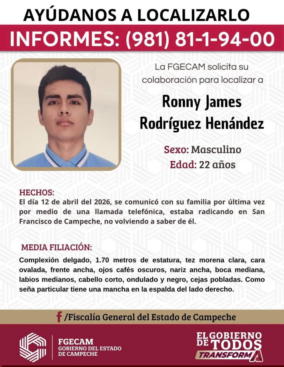 Las autoridades exhortaron a la población a proporcionar cualquier dato que pueda contribuir a la localización del joven, a través de los canales oficiales de la FGECAM o números de contacto habilitados para este caso.