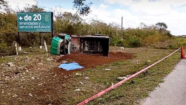 Yucatán.- Un trabajador murió tras volcar y su volquete, al parecer presentó una falla mecánica, esta mañana en la carretera Mérida-Tetiz.