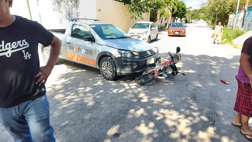 Playa del Carmen.- Con una fractura en una pierna terminó un motociclista que circulaba en la colonia Ejido; éste fue impactado por el chofer de una camioneta de una empresa de materiales de construcción, al parecer no respetó su alto al salir de una calle.