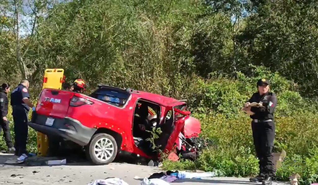 Uno de los vehículos (de una empresa de construcción), que circulaba de oriente a poniente con varios trabajadores a bordo y otra camioneta, una Ram color rojo, de una familia que presuntamente habría invadido el carril opuesto.