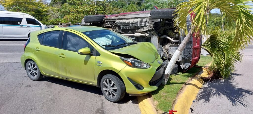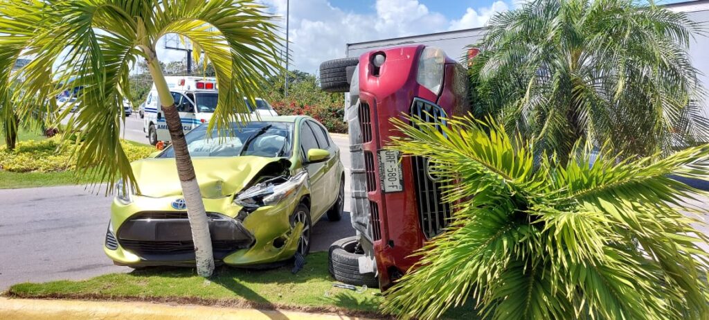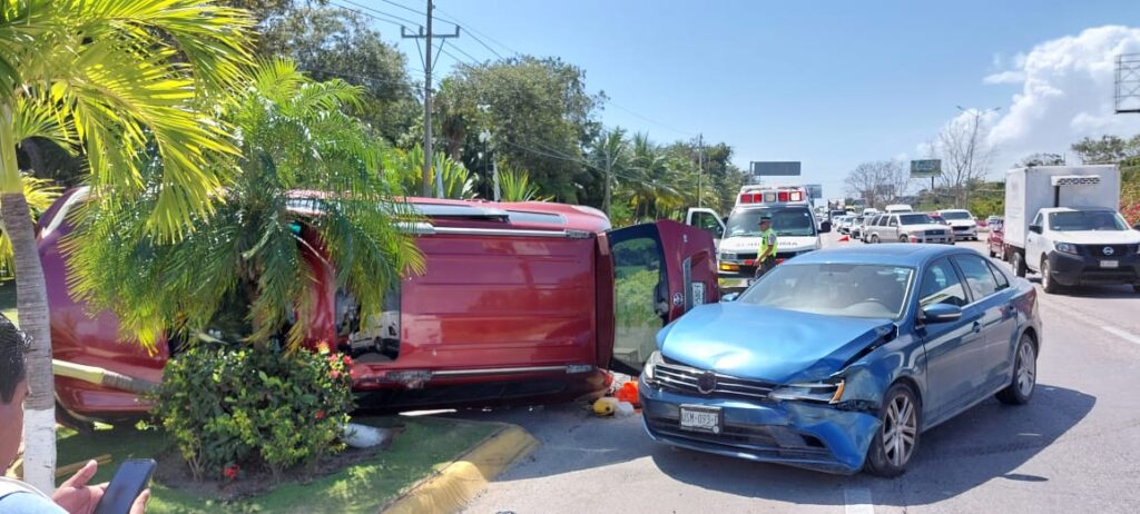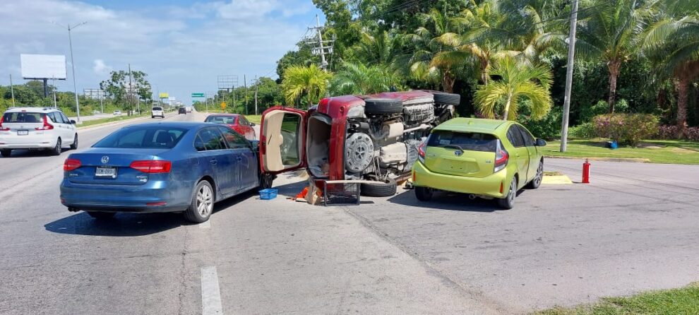 Playa del Carmen.- Al menos tres personas lesionadas, una camioneta volcada y dos vehículos con graves daños en su carrocería fue el saldo que dejó un fuerte accidente en la carretera federal 307 a la altura del Hotel Dorado Royale.