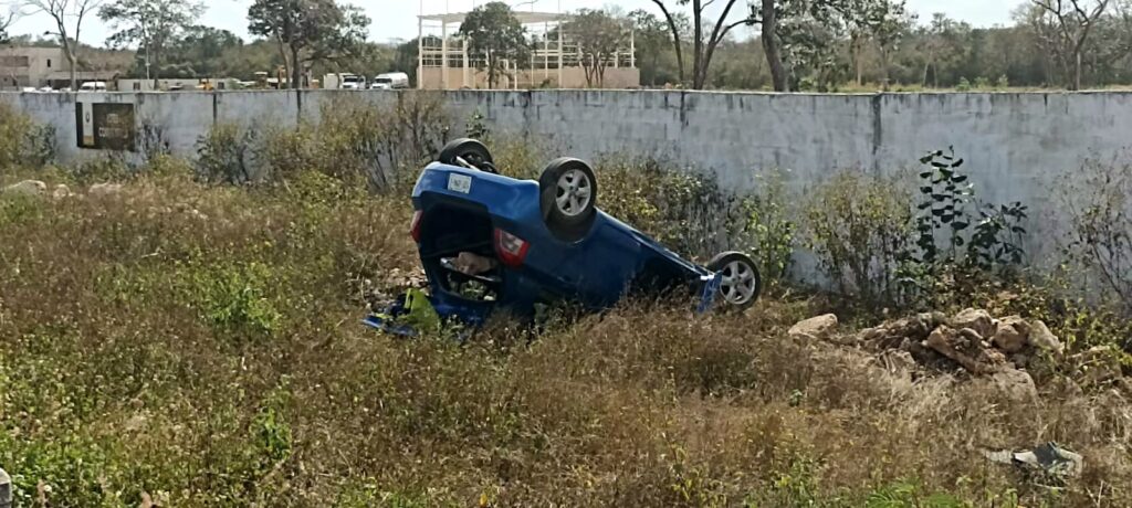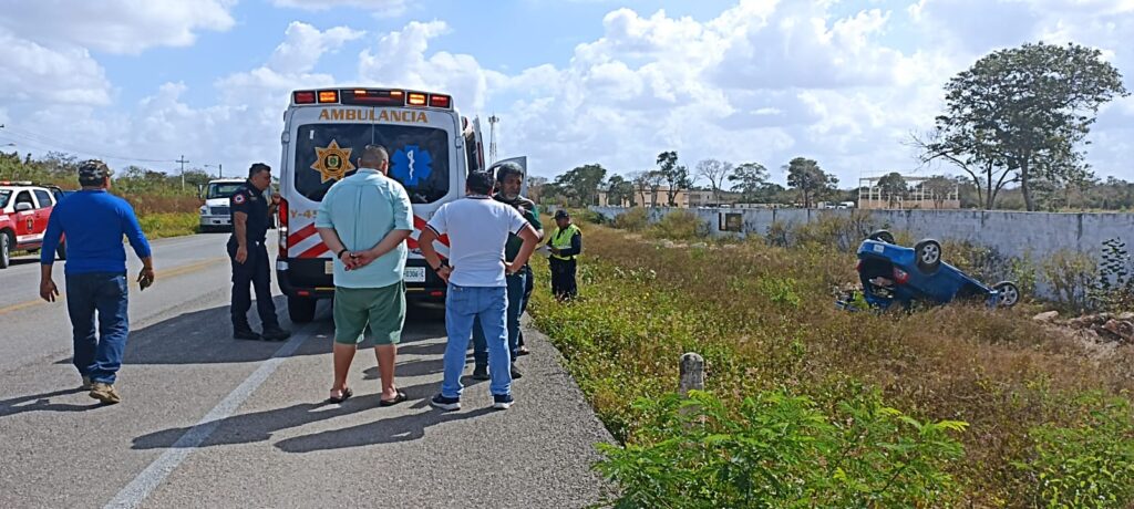 Merida.- Una mujer salió herida luego de volcar en la carretera Mérida-Tetiz tras perder el control de su automóvil.