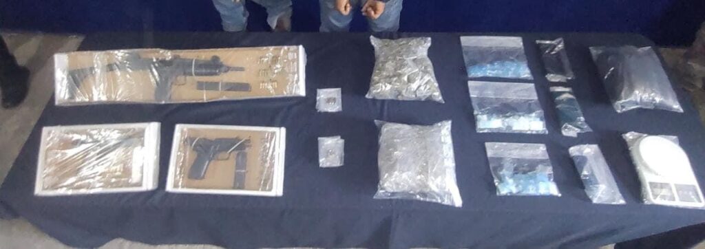 Se les aseguró un arma calibre 45, una 9 milímetros, un arma larga tipo uzi y diversos cartuchos, asimismo 231 dosis de diversas sustancias, una bolsa mediana con hierba seca y una báscula.