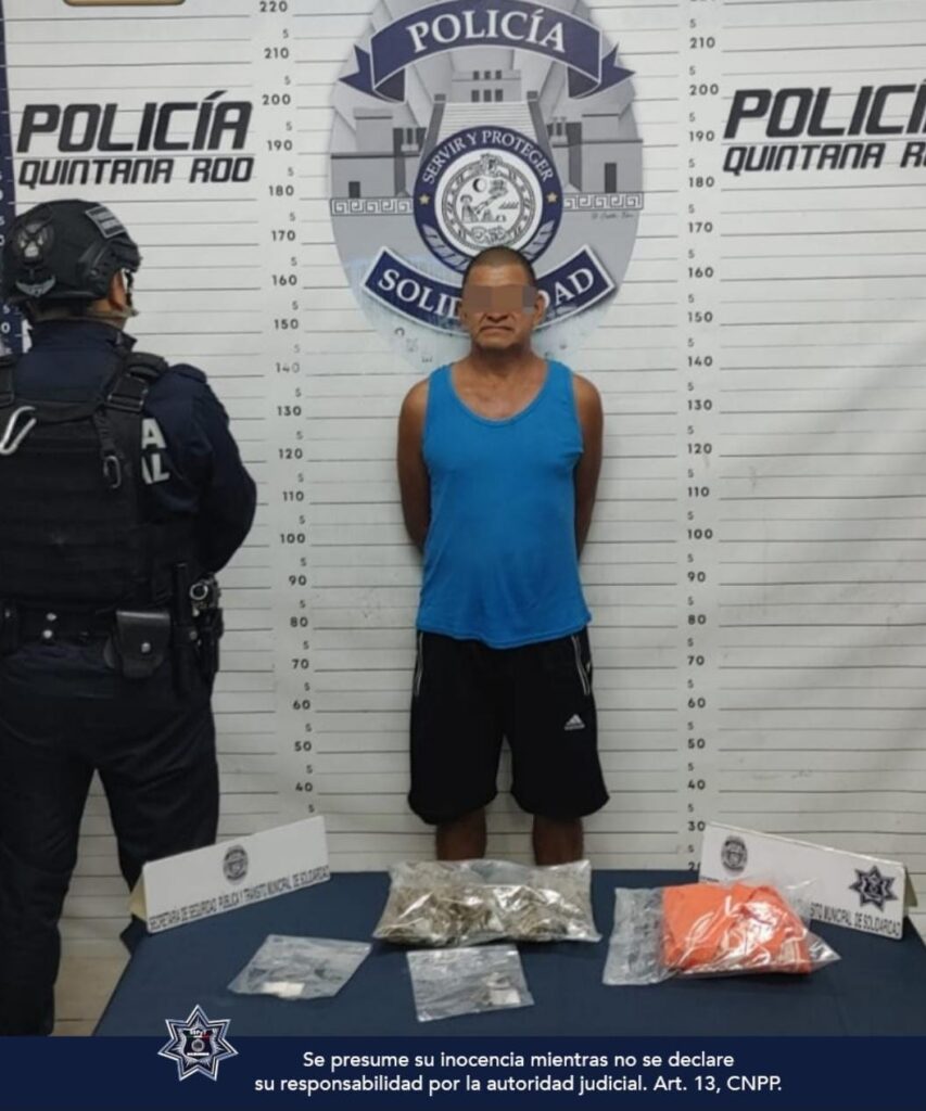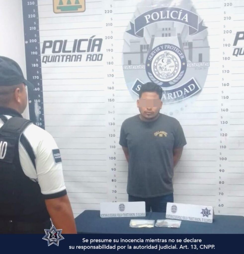 En otro momento, durante la misma madrugada, elementos de la PolicĂa TurĂstica patrullaban sobre la Quinta avenida y a la altura de la calle 30 aseguraron a JosĂ© “N”, de 20 años de edad, originario de Tabasco, en posesiĂłn de dos envoltorios con posible marihuana y ocho con polvo blanco al parecer cocaĂna.