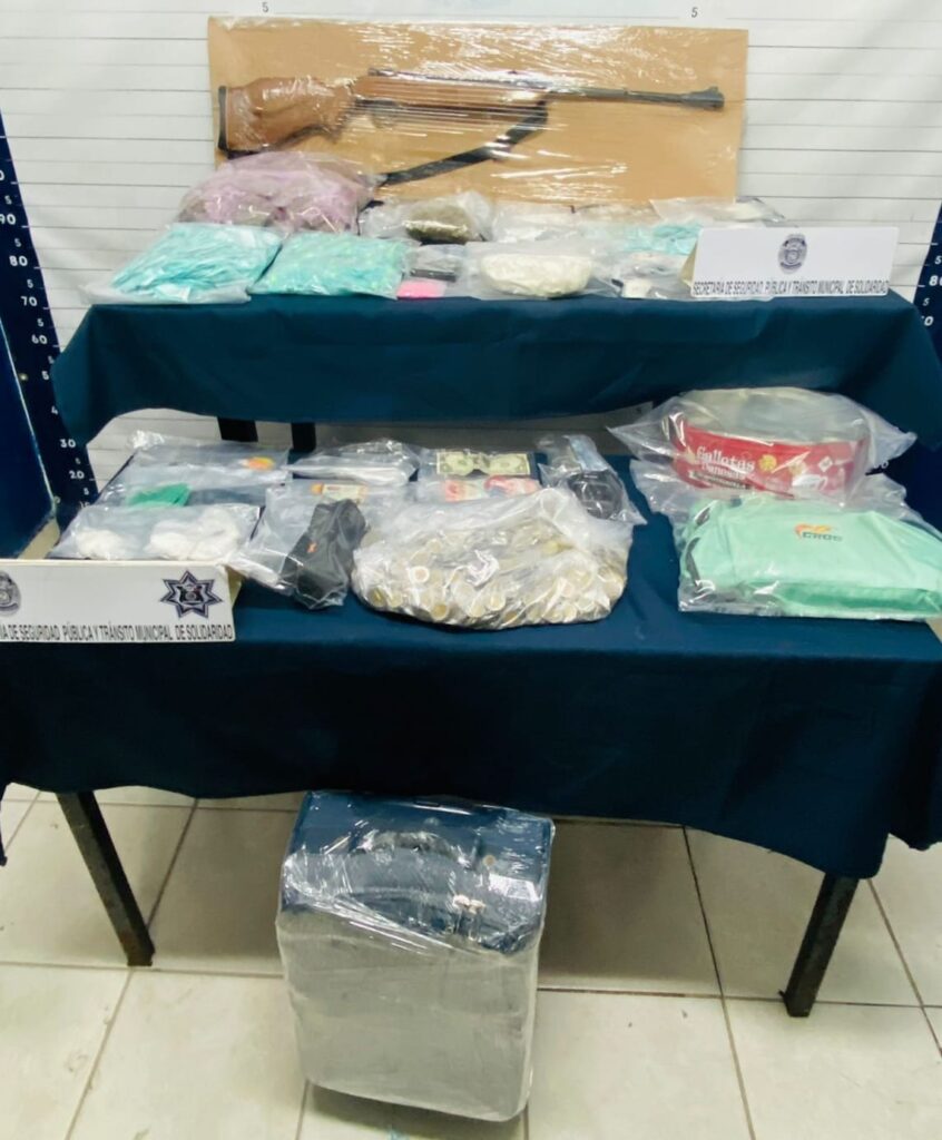 Esto derivado del hallazgo, segĂșn un comunicado de la SecretarĂa de Seguridad PĂșblica de Solidaridad, el pasado jueves 2 de marzo, de 102 envoltorios con posible marihuana, mil 352 con polvo blanco al parecer cocaĂna, 80 con lo que parece LSD, 343 con la posible droga conocida como cristal, 240 envoltorios con lo que parece el narcĂłtico conocido como Ă©xtasis, cinco con posible piedra, uno con hachĂs y ocho mil 24 pesos en efectivo, asĂ como una escopeta.