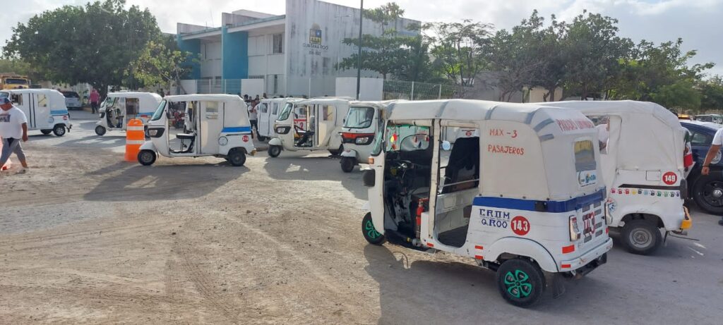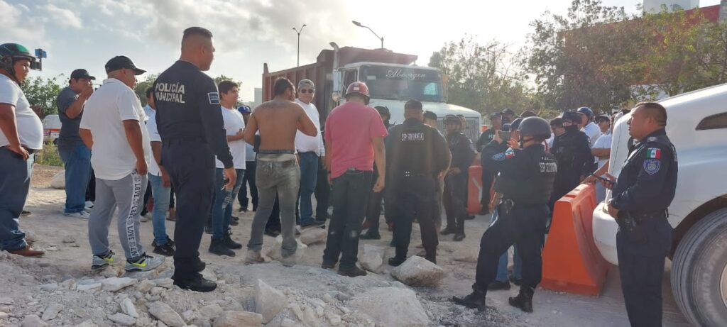 Playa del Carmen.- Mototaxistas bloquearon parcialmente una de las avenidas del fraccionamiento Villas del Sol, para presionar a los volqueteros que trabajan para el proyecto del ‘Tren Maya’, tras un accidente de un mototaxista contra un volquete.