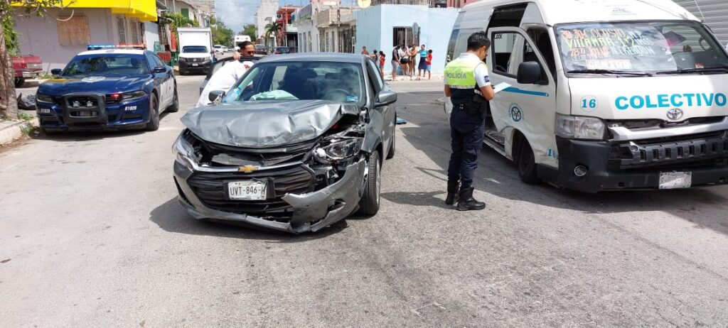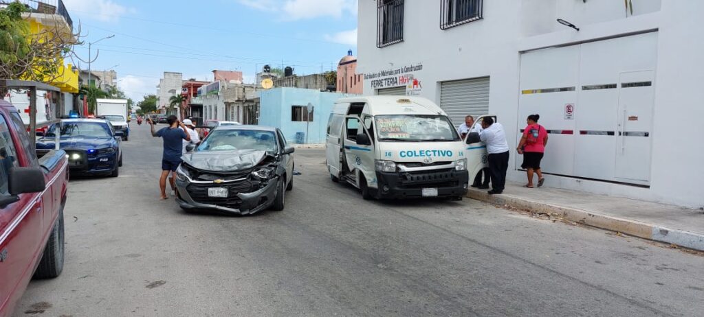 Por lo fuerte del impacto, la unidad colectiva, pasó del carril izquierdo a la esquina contraria de ambas calles, mientras que el chofer del vehículo dobló y quedó en el carril izquierdo de la avenida Tulum.