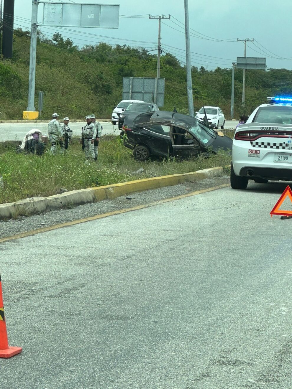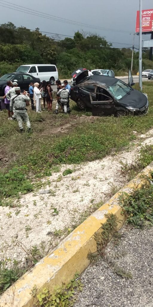 Puerto Morelos.- Por una falla en un neumático fue la causa que el conductor de un vehículo volcara y terminara dentro del camellón central a la altura de Puerto Morelos, en la carretera federal 307, por fortuna nadie resultó herido.