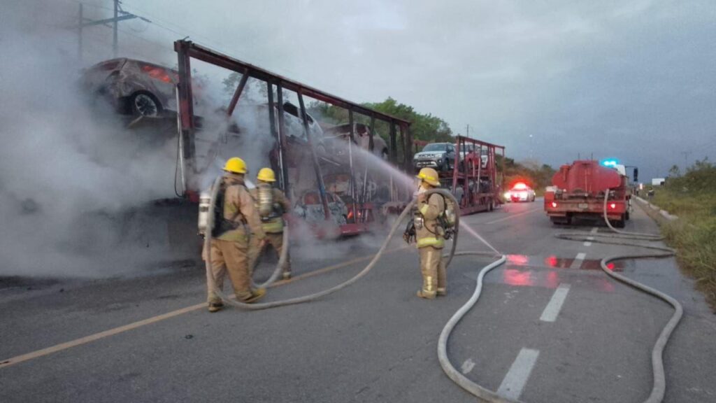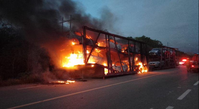 🔺La madrugada de este lunes, seis autos y el camión que los transportaba, fueron consumidos por el fuego; hasta el momento se desconocen los motivos.