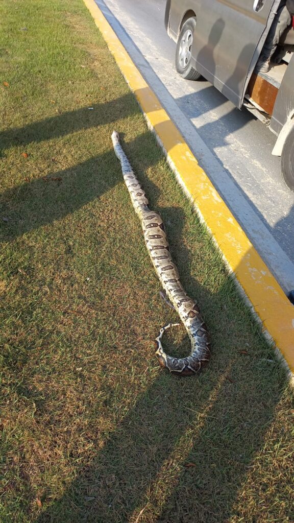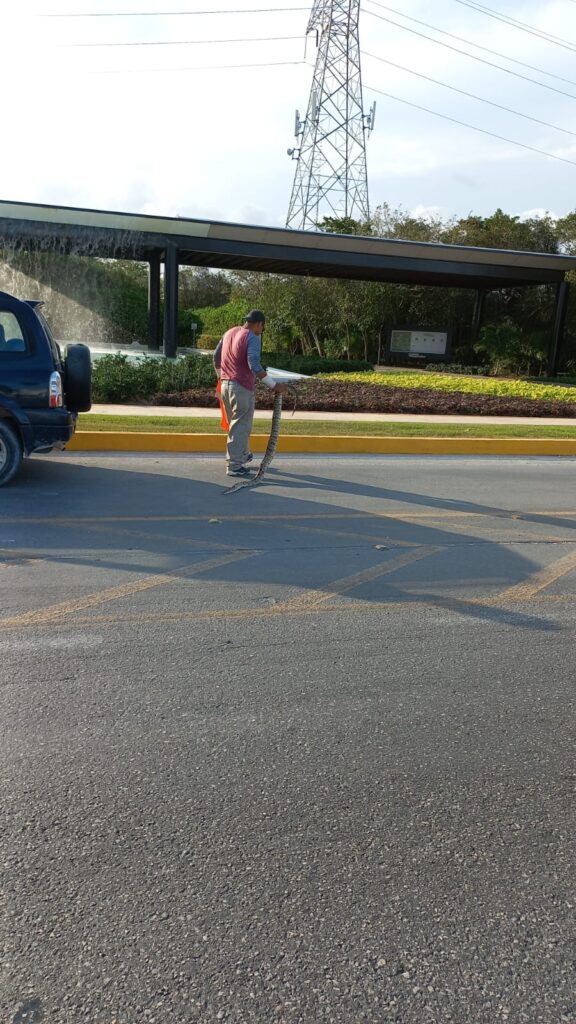 El hecho ocurrió sobre el bulevar Playa del Carmen a la altura del hotel Grand Velas, cuando taxistas que pasaban por la zona se percataron de una serpiente de dos metros de largo, qué intentaba cruzar la carretera, por lo que le dieron paso deteniendo un poco el tráfico.