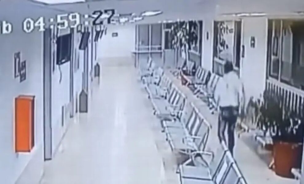 En el material se observa a Mario “N” esposado a una banca del hospital, pero comienza a jalar con fuerza para lograr zafarse de la estructura; lo hace en repetidas ocasiones hasta que lo logra. La sala de espera permanece sola y el joven carece de supervisión.
