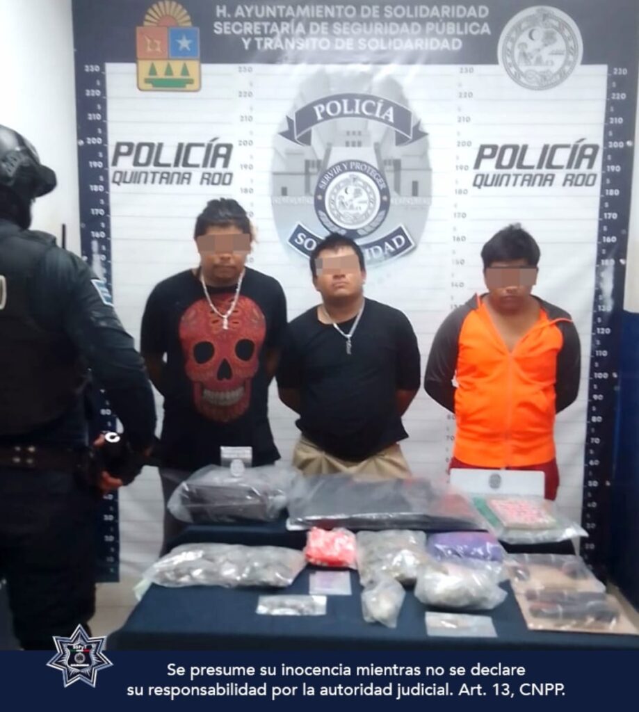 Playa del Carmen.- Policías de Solidaridad aseguraron a tres sujetos, dos armas de fuego, cartuchos útiles, un chaleco balístico y más de 130 envoltorios con posibles drogas esto en el fraccionamiento In House.