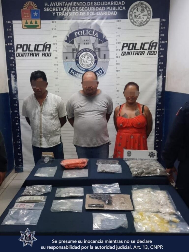 Playa del Carmen.- En una rápida intervención, la Policía Municipal de Solidaridad aseguró a tres personas, un arma de fuego con un cargador abastecido con 7 cartuchos, más de 600 envoltorios con posibles narcóticos, un mototaxi y un inmueble, en el fraccionamiento Villas del Sol.