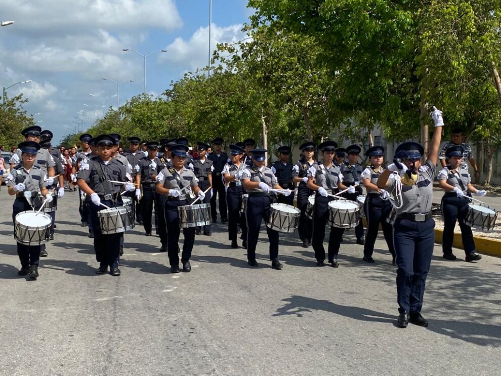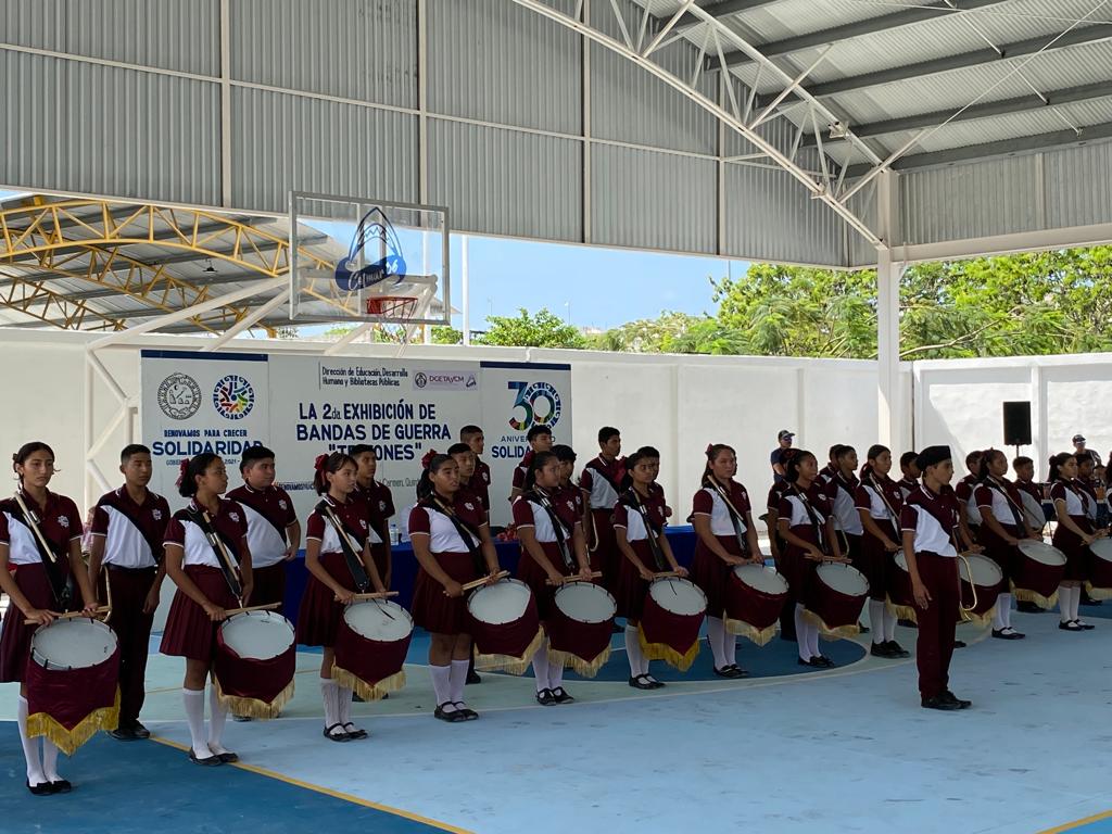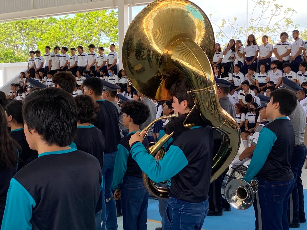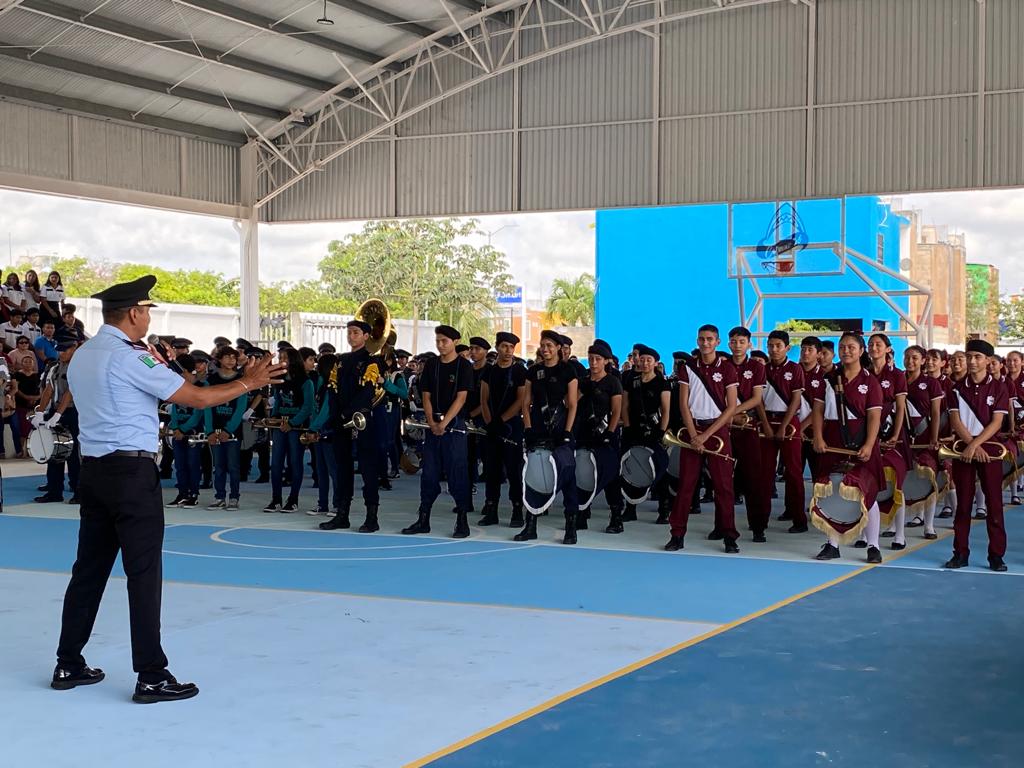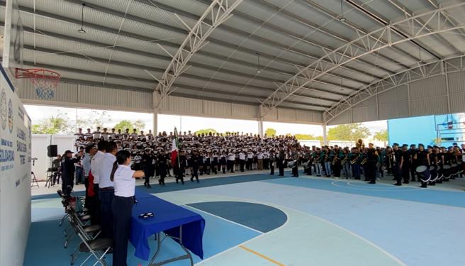 Playa del Carmen, Solidaridad, 6 de mayo del 2023.- Promoviendo valores cívicos y de identidad nacional, en recientes días el gobierno que preside Lili Campos llevó a cabo la primera exhibición de bandas escolares entre alumnos del nivel medio superior, evento realizado en el Centro de Estudios Tecnológicos del Mar (CETMAR), en el fraccionamiento Villas del Sol.