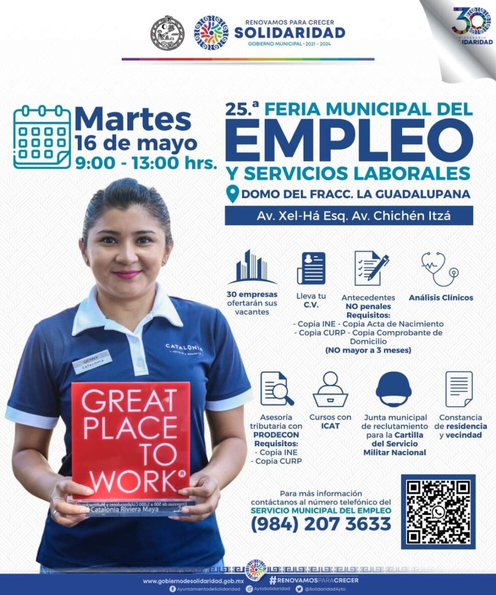 Playa del Carmen, Solidaridad, 15 de mayo del 2023.- Con el objetivo de contribuir con la economía familiar e impulsar el trabajo formal, el gobierno que preside Lili Campos realizará este martes 16 de mayo la 25ª Feria Municipal del Empleo y Servicios Laborales en el domo del fraccionamiento La Guadalupana, donde 30 empresas ofrecerán 1 mil 750 puestos.