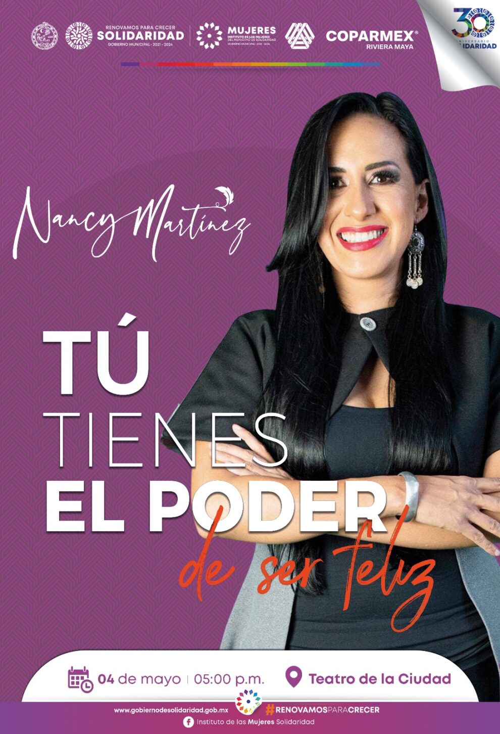 Lenny Hau Cruz, directora de dicha institución, informó que la conferencia será el 4 de mayo en el Teatro de la Ciudad, a las cinco de la tarde. Añadió que la impartirá Nancy Martínez, empresaria, consultora, coach, conferencista internacional y fundadora de la certificación internacional de empresas “Más Felices” -anteriormente llamado Ranking Internacional de Felicidad Empresas Heroínas-, que busca reconocer y empoderar a las empresas que apuestan todo por el bienestar y felicidad de sus colaboradores.
