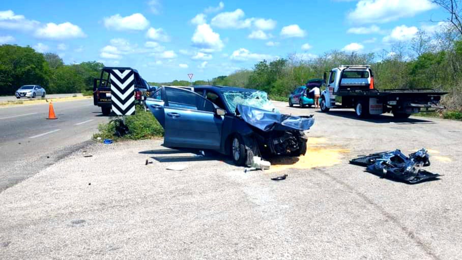 Merida.- Con graves lesiones acabaron cinco personas, una de ellas prensada, al estrellar su auto contra un tractocamión en la carretera Mérida-Hoctún.