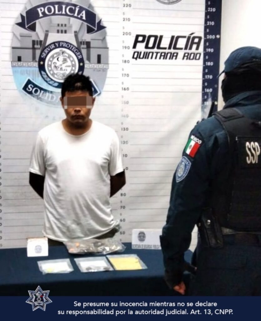 Playa del Carmen.- Policías Municipales de Solidaridad aseguraron a una persona en posesión de posibles narcóticos como marihuana, hachís y cristal; fue en el fraccionamiento Villas del Sol.
