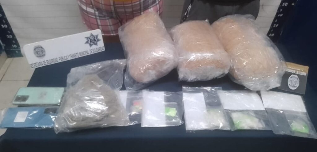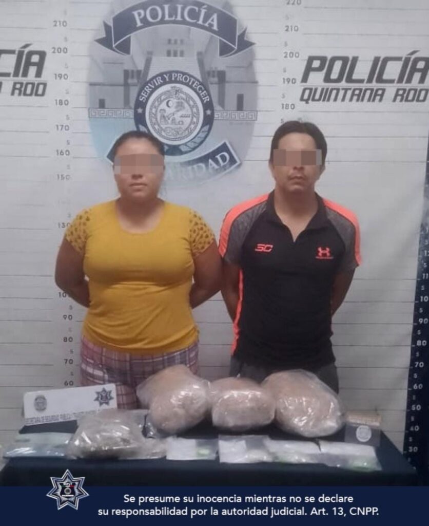 Playa del Carmen.- En operativo de vigilancia y prevención de delitos en la colonia Ejido, elementos de la Policía Municipal de Solidaridad aseguraron a dos personas en posesión de 3 paquetes y más de 100 envoltorios con posibles drogas como marihuana, piedra, cocaína, pastillas y LSD.