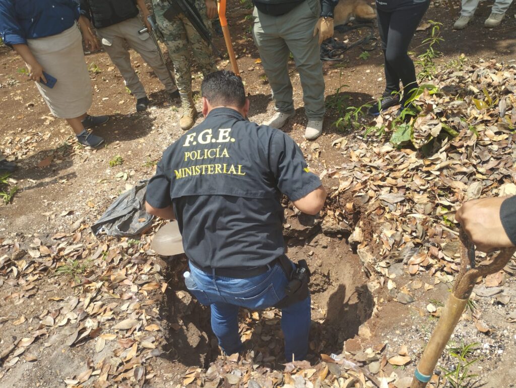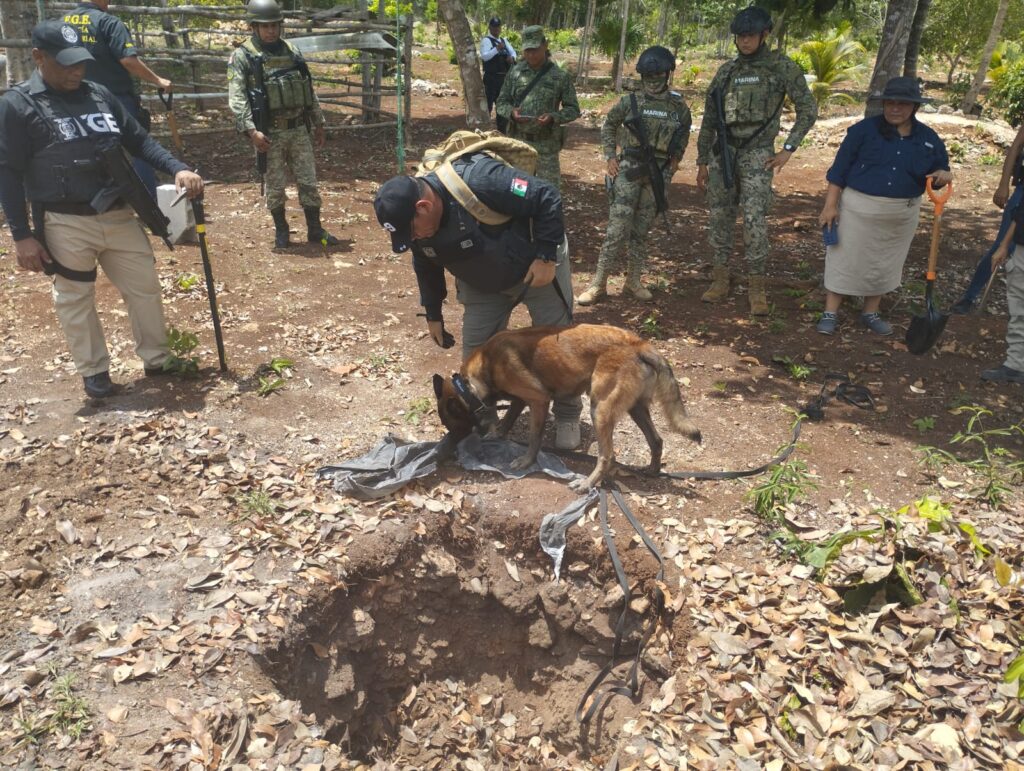 Asimismo, en la zona sur de la Entidad, los trabajos tuvieron lugar en un rancho, cerca del basurero, aproximadamente a dos kilómetros de Calderitas, municipio de Othón P. Blanco, por hechos relacionados con una carpeta de investigación abierta por desaparición cometida por particulares.