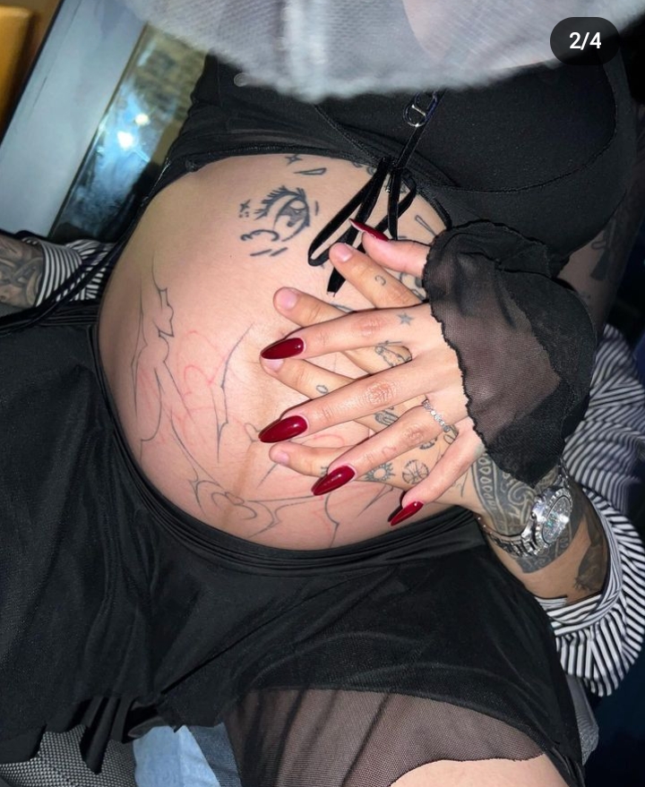 Mostrando con orgullo su barriguita, lo hizo con su estilo caracterĂstico, vistiendo un top corto negro revelador con detalles transparentes y una minifalda a juego en tonos oscuros, de acuerdo con Vox Populi.