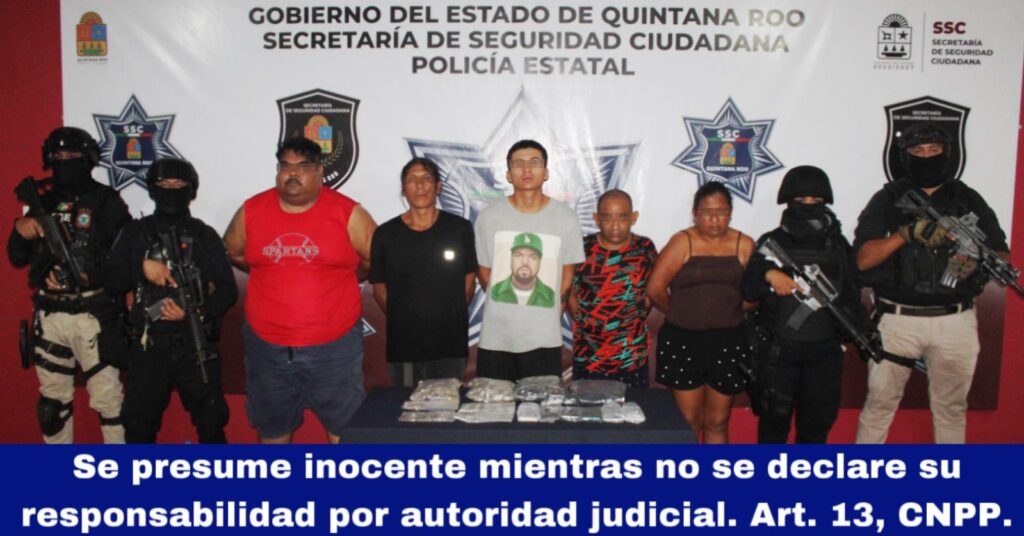 Cancún.- La Secretaría de Seguridad Ciudadana (SSC), en colaboración con la Fiscalía General del Estado (FGE), puso a disposición a cinco personas por su probable participación en delitos contra la salud.