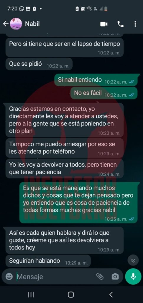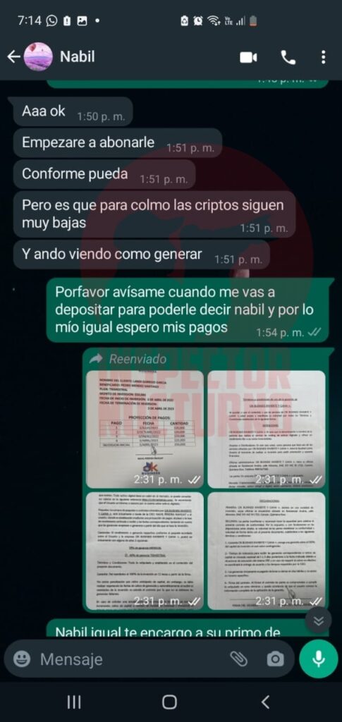 Sin embargo, el 12 de mayo de 2022 decidieron retirar parte de su inversión y es ahí cuando Nabil declara la empresa detenida por el Sistema de Administración Tributaria (SAT) y hace una reunión donde les firma y se compromete a devolver cada 3 meses el dinero, pasó un año y hasta el día de hoy no ha devuelto nada.
