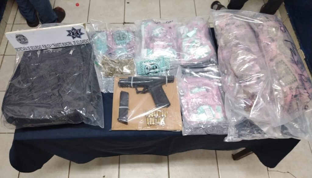 William “N” de 21 años originario de Campeche y Adolfo”N” de 22 años originario de Veracruz, un arma de fuego abastecida de un cargador con 15 cartuchos, tres bolsas medianas con posible marihuana y 5 bolsas en las que cada una contiene envoltorios con lo que parece ser droga, en dos cocaína, dos con éxtasis y una posible cristal, fueron asegurados en la colonia Centro.
