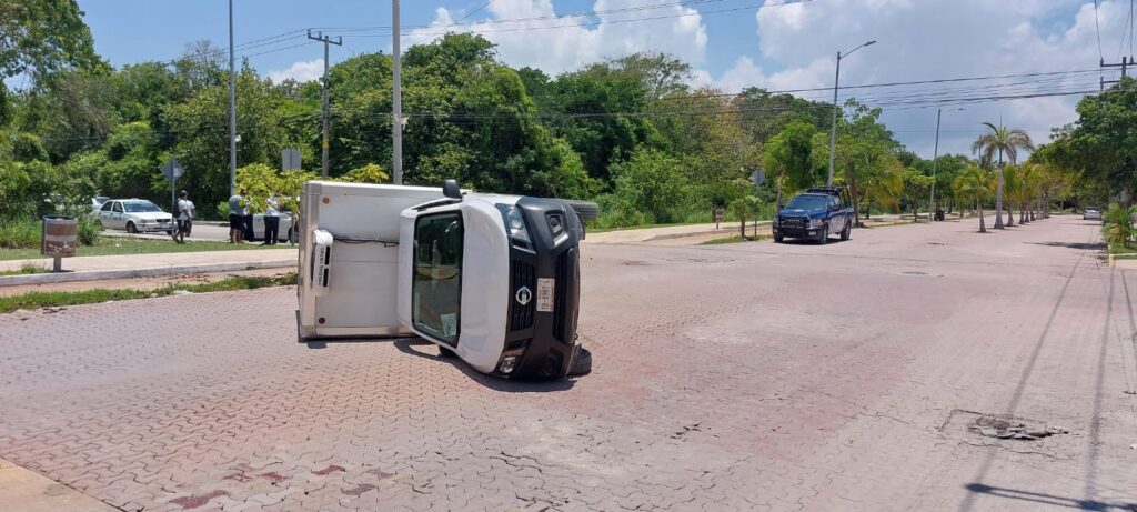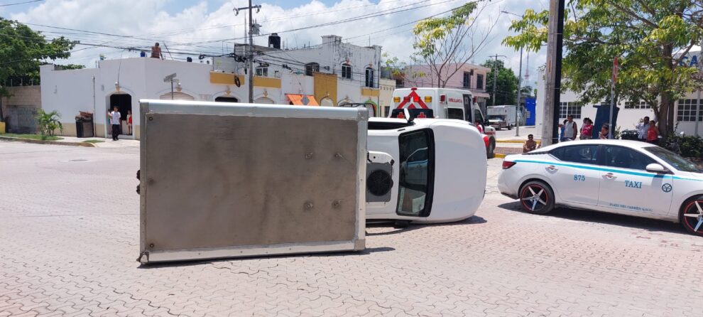 Playa del Carmen.- Volcada sobre uno de sus costados termin贸 una camioneta transportadora de alimentos congelados en la colonia Nicte Ha, donde el conductor no respet贸 su alto y se atraves贸 en la trayectoria de un taxi que era conducido con exceso de velocidad, que lo impact贸 en uno de sus costados.
