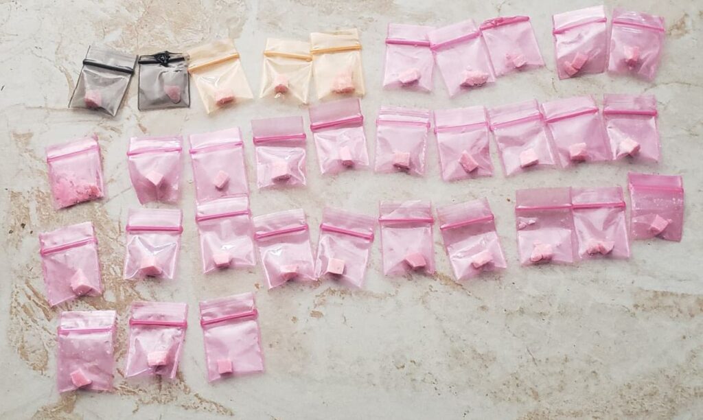 Como resultado de trabajos de inteligencia, campo y gabinete, Policías de Investigación adscritos a la Fiscalía Especializada en Delitos contra la Salud en su Modalidad de Narcomenudeo, al ingresar al inmueble, encontraron bolsitas con dosis de sustancia sólida de color rosa con características equivalente a la cocaína.