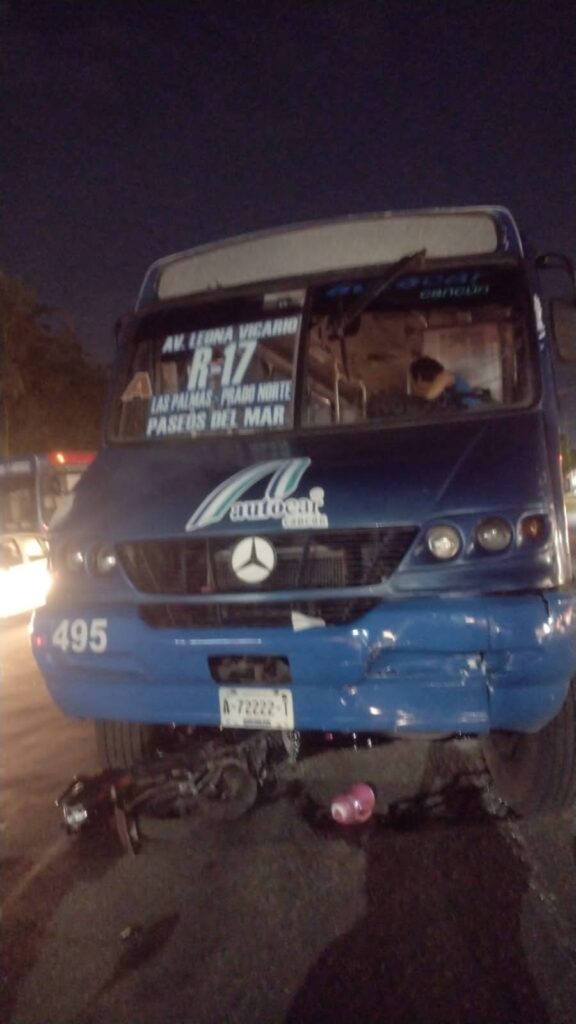 Cancún.- Una pareja que circulaba en una motocicleta fueron atropellados por el conductor de una camión de transporte público en el fraccionamiento Villas Lakin.