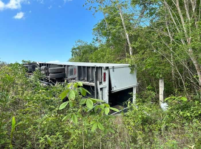 De acuerdo a la información el conductor del pesado camión viajaba rumbo a Cancún, para llevar su cargamento, cuando sufrió una falla mecánica que lo hizo perder el control y volcara la unidad a un costado de la vialidad.