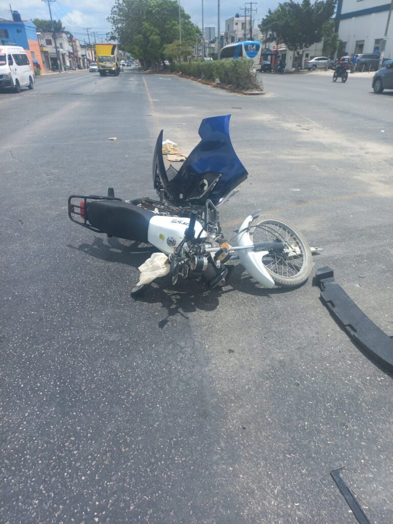 Aparatoso accidente se registró sobre avenida Lakin en Tierra Maya, luego de que el conductor de una motocicleta se atravesó sin precaución y provocó ser impactado por un automovilista.