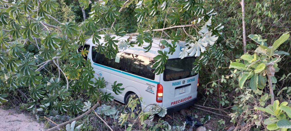 Playa del Carmen.- El chofer de una combi local, provocó un grave accidente en el fraccionamiento Villas del Sol, esto luego de que al ir manejando alcoholizado, provocó que colisionara a dos vehículos para luego descarrilarse y terminar dentro de un área selvática.