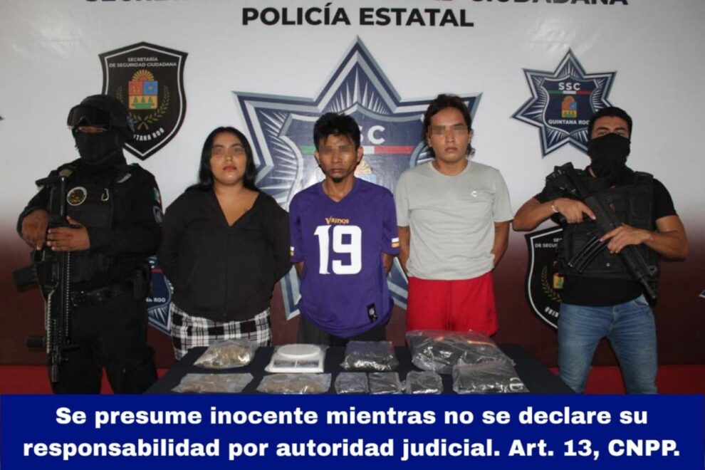 CancĂșn.- Por delitos contra la salud y posiblemente tentativa de homicidio, dos sujetos y una mujer fueron detenidos por policĂas estatales y ministeriales en la supermanzana 93.