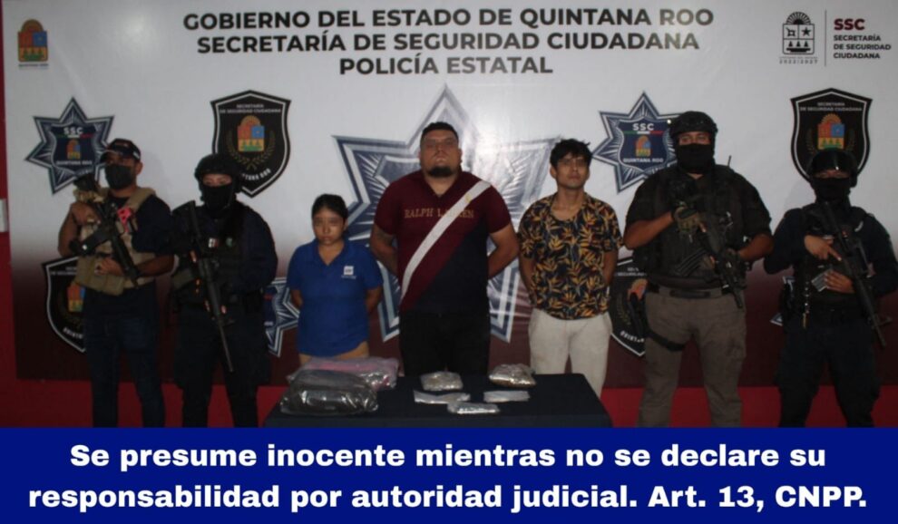Las autoridades detuvieron a Uzziel Fabrizzio “N” alias “El Gordo”, Joshua Javier “N “Quichi” y Liliana “N”; el arresto sucedió en la avenida Gastón Alegre López (Rancho Viejo) con calle 8 Norte, del municipio de Isla Mujeres.