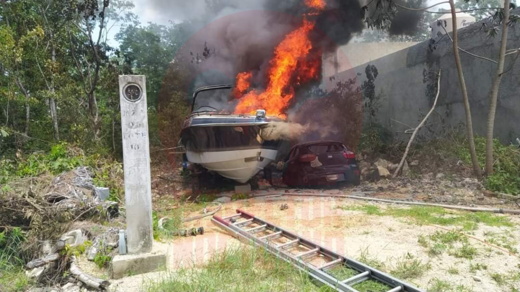 🔺Se presume que el fuego se originó porque los cristales de la embarcación generaron fuego, rápidamente se extendió y alcanzó un automóvil; los bomberos lograron controlar la conflagración.