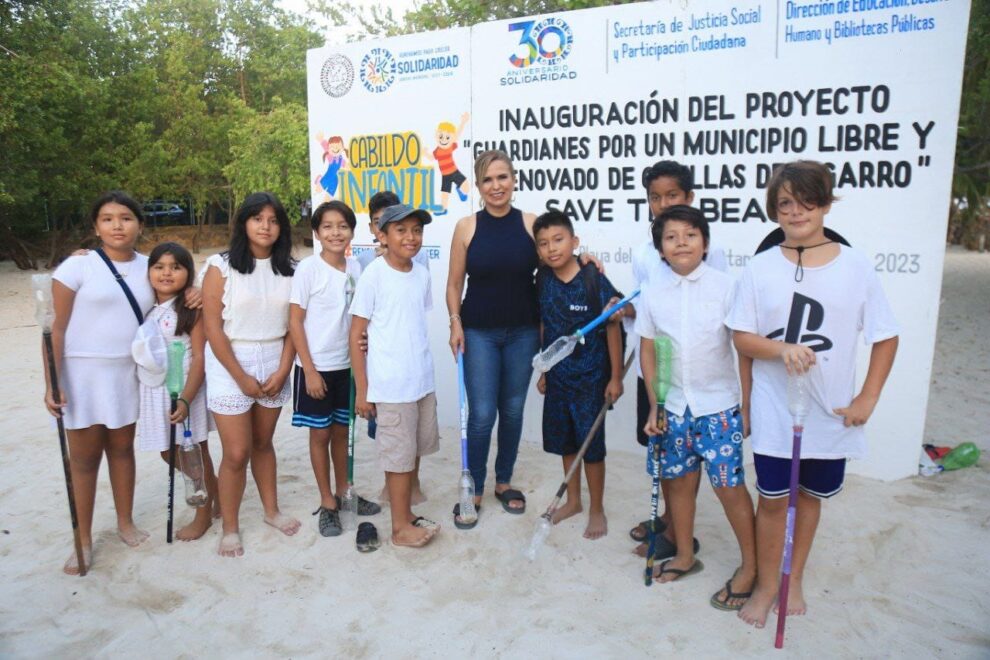 Playa del Carmen.- Con la finalidad de generar conciencia sobre la contaminación de las playas al arrojar colillas de cigarro en la arena, la edil Lili Campos en compañía del cabildo infantil cortó el listón inaugural del proyecto “Guardianes por un municipio renovado y libre de colillas de cigarro save the beach”