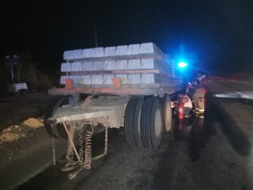 🔺El chofer de un camión con dos remolques que transportaban durmientes del Tren Maya, se dio cuenta que el segundo se estaba quemando y evitó que fuera consumido por el fuego.