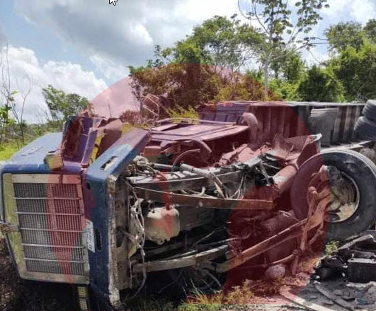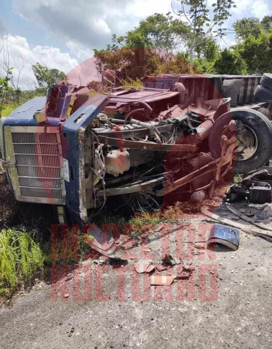 🔺 En la carretera federal 186, tramo Chetumal – Nicolás Bravo, un camión que transportaba material para la obra del Tren Maya se quedó sin frenos al salir de una curva.