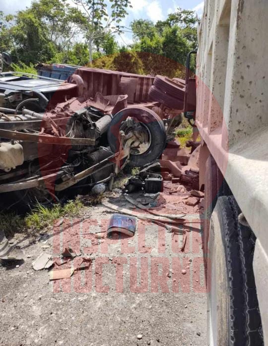 El percance ocurrió ayer en la tarde sobre la carretera antes mencionada, cuando una de las unidades circulaba en dirección a las obras del frente 2 del tramo 7 del tren maya, pero al salir de una curva los frenos le fallaron al volquete de color azul y colisionó de manera frontal contra otra unidad que también llevaba material pétreo.
