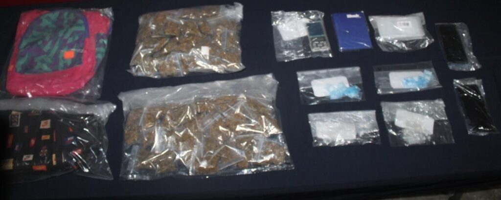 Según las autoridades, se les encontró 102 dosis de hierba seca, 32 de una sustancia sólida, 24 de cristal, bolsas pequeñas tipo ziploc, una báscula y celulares.