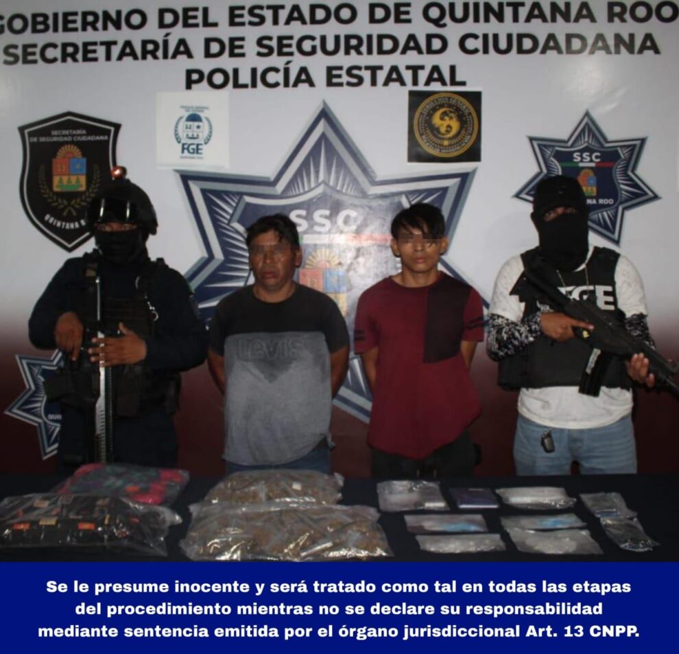 Cancún.- Con decenas de dosis de estupefacientes fueron detenidos dos hombres, en calles de la supermanzana 228, presuntamente dedicados al narcomenudeo .