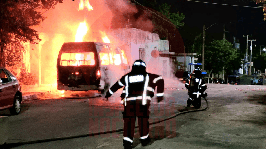 Playa del Carmen.- Una camioneta tipo Urban de transportes foráneos se incendió en el fraccionamiento Puerto Maya, terminó calcinado por completo; los vecinos se percataron de que se estaba quemando que reportaron al 911.
