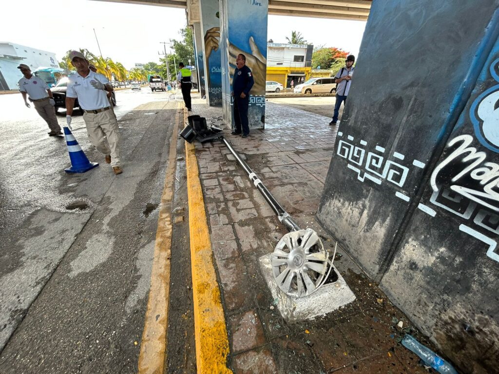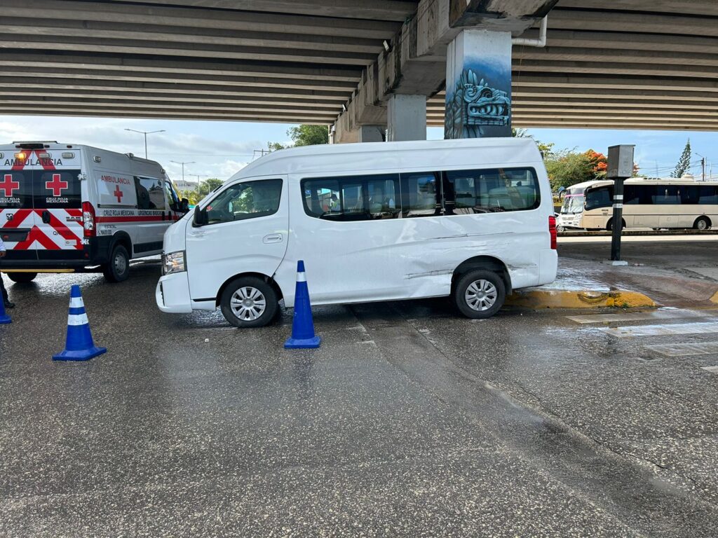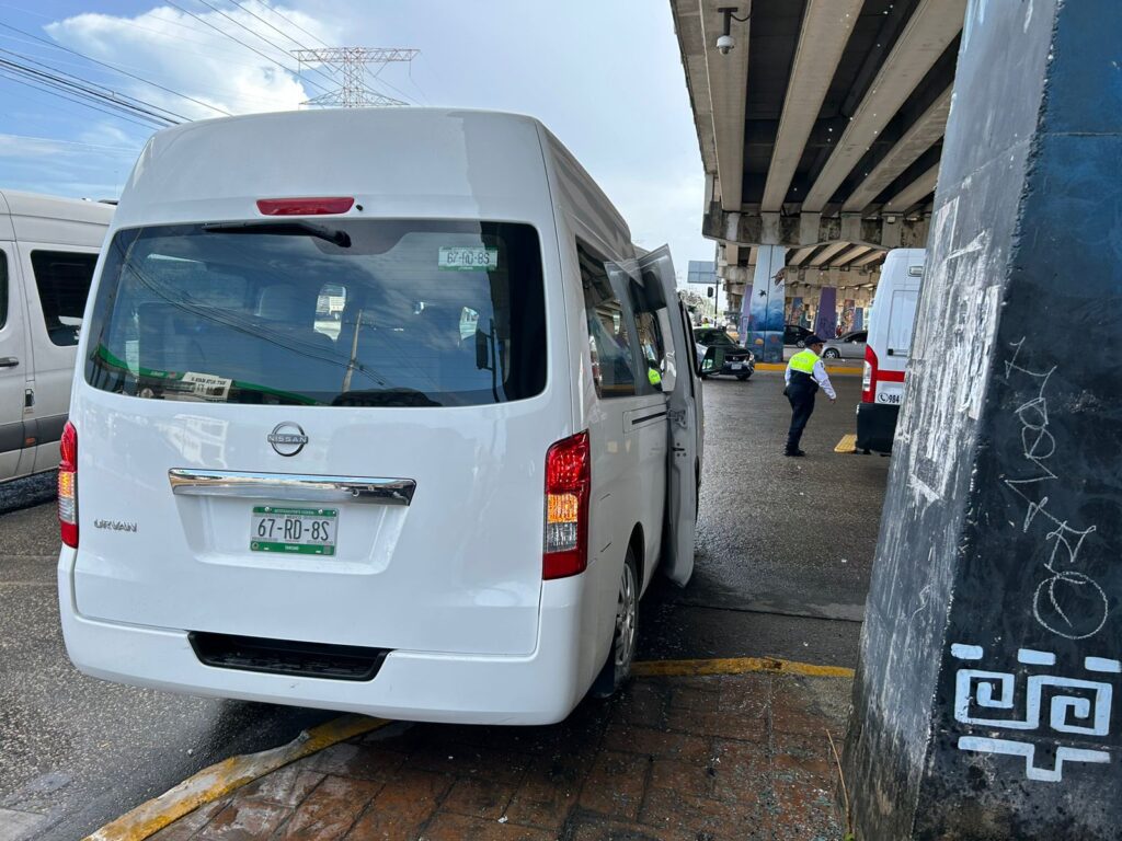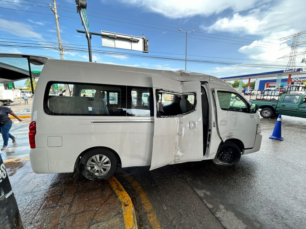 En dirección hacia el sur sobre el Boulevard circulaba una Nissan Urvan con placas federales 67 – RD – 8S, la cual pertenece a una empresa de transportación turística, que fue colisionada en su costado izquierdo haciendo que diera un giro, quedando en sentido contrario al que venía, además de subirse a la banqueta y derribar el poste del semáforo que se encuentra en esa zona.